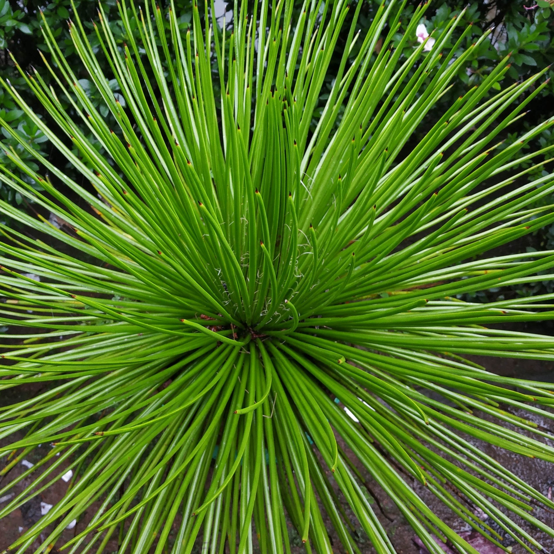 Tight rosette of thin, dark green, linear leaves