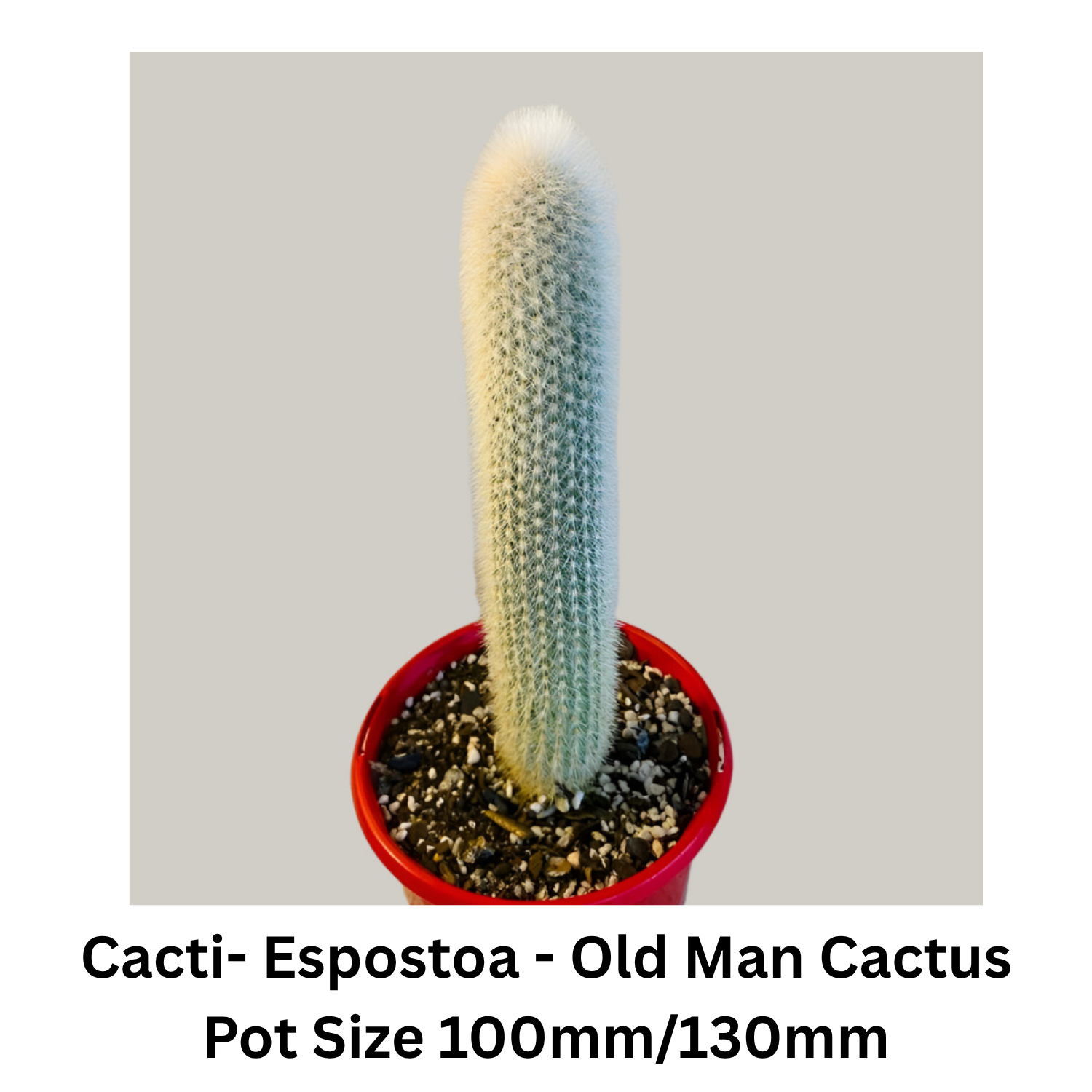 Espostoa lanata (Old Man Cactus) – Columnar cactus covered in dense white hair, adding unique texture.