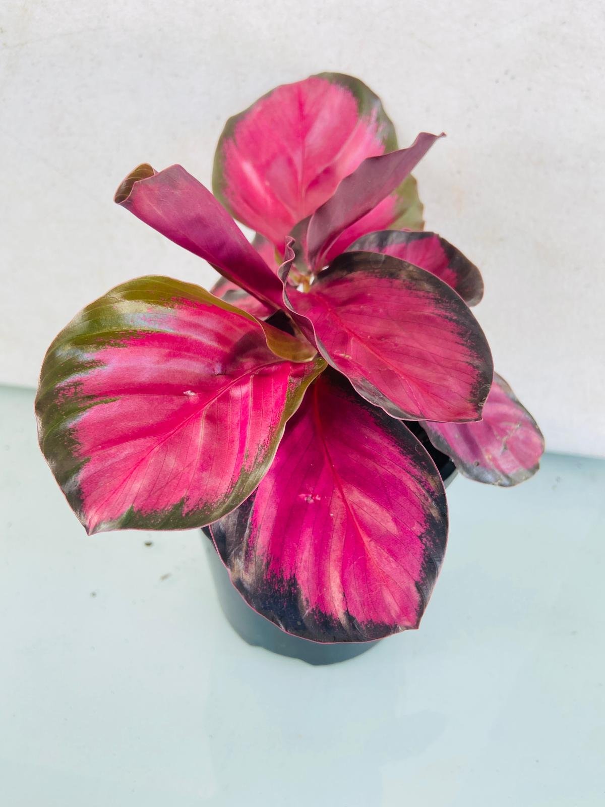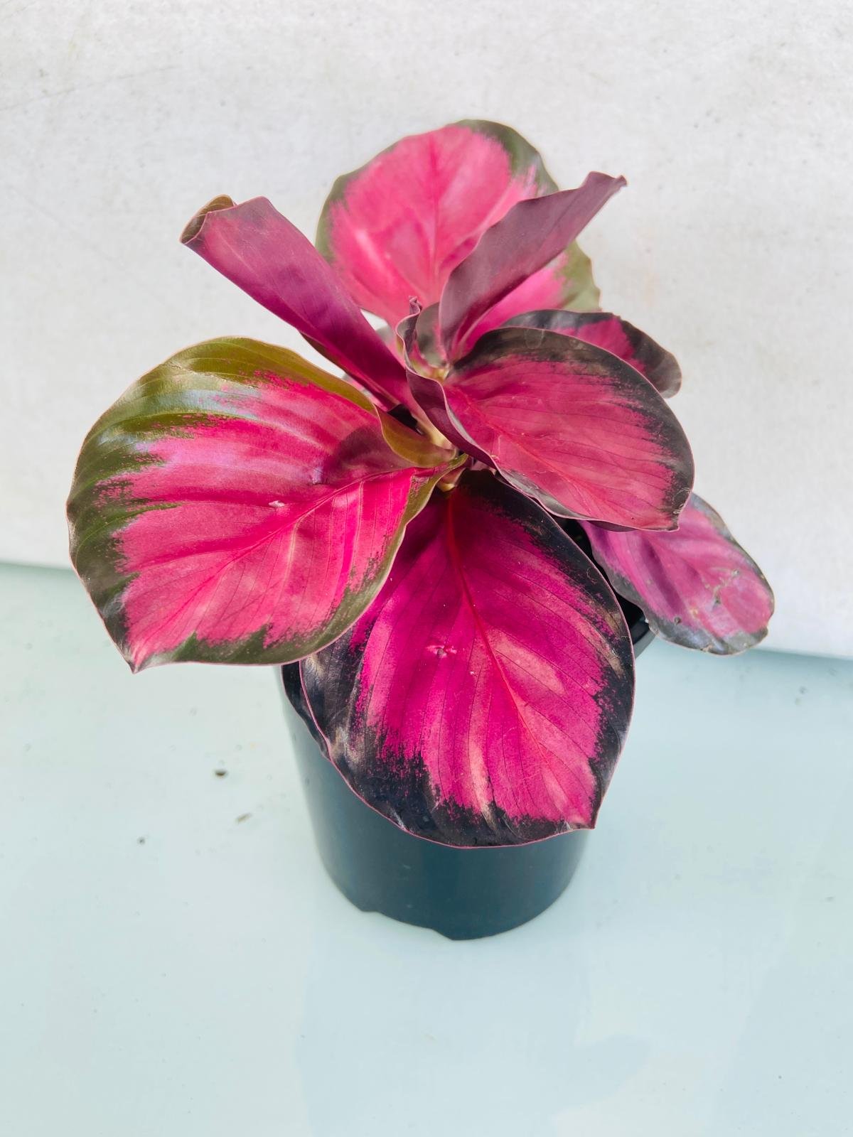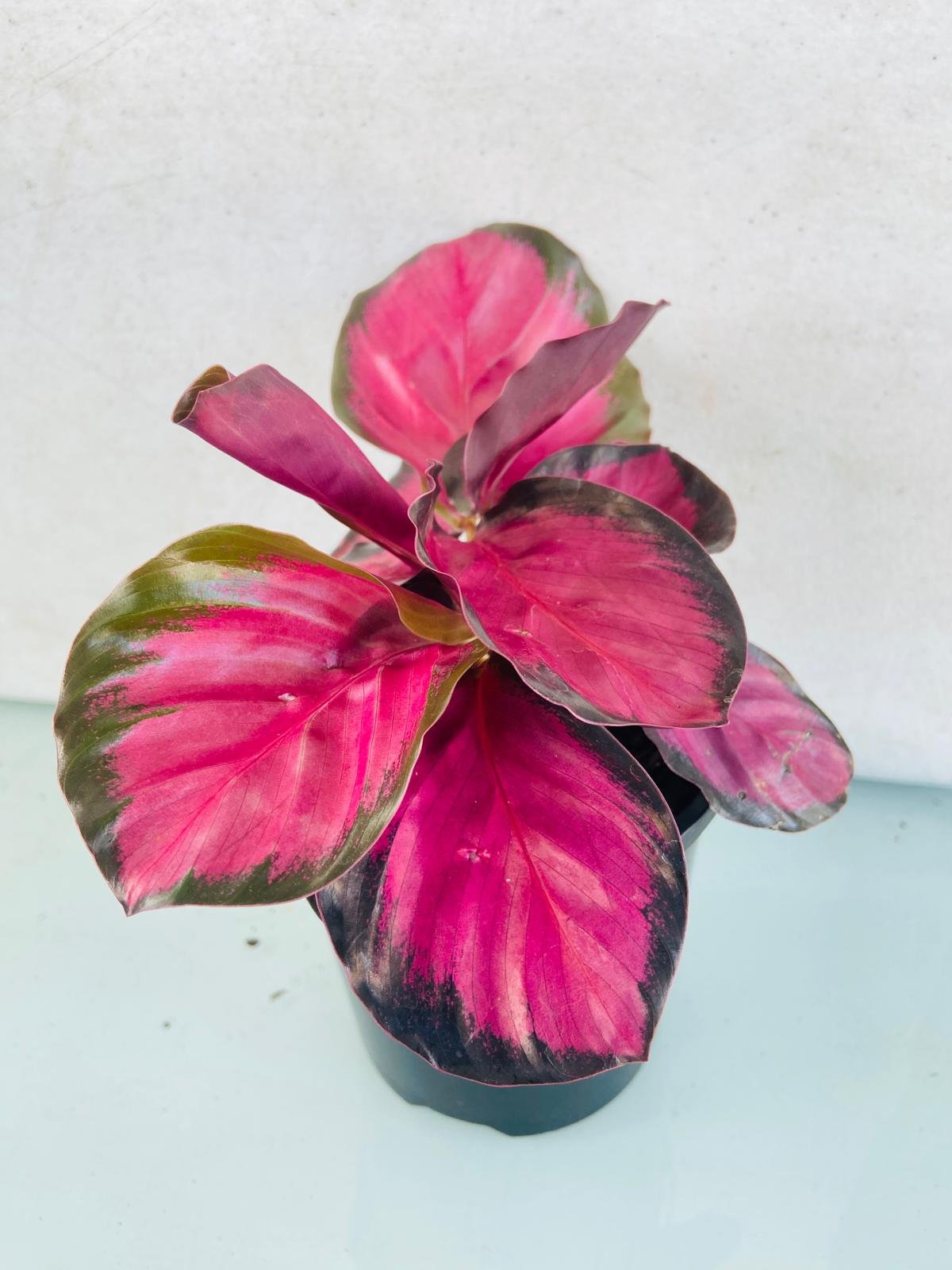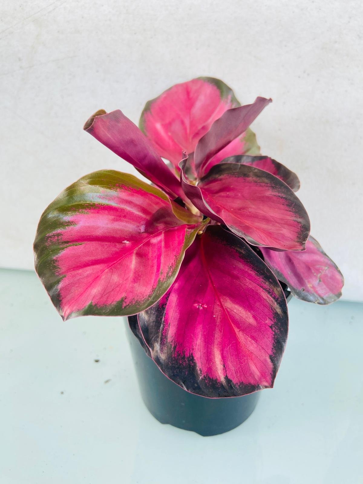The Calathea Crimson Black is an eye-catching indoor plant admired for its striking dark foliage with deep crimson undersides. A member of the prayer plant family, this variety adds drama and elegance to any indoor space with its bold colors and graceful leaf movement. Its leaves naturally fold upward in the evening and unfurl with the morning light, bringing a touch of rhythm and life to your home.