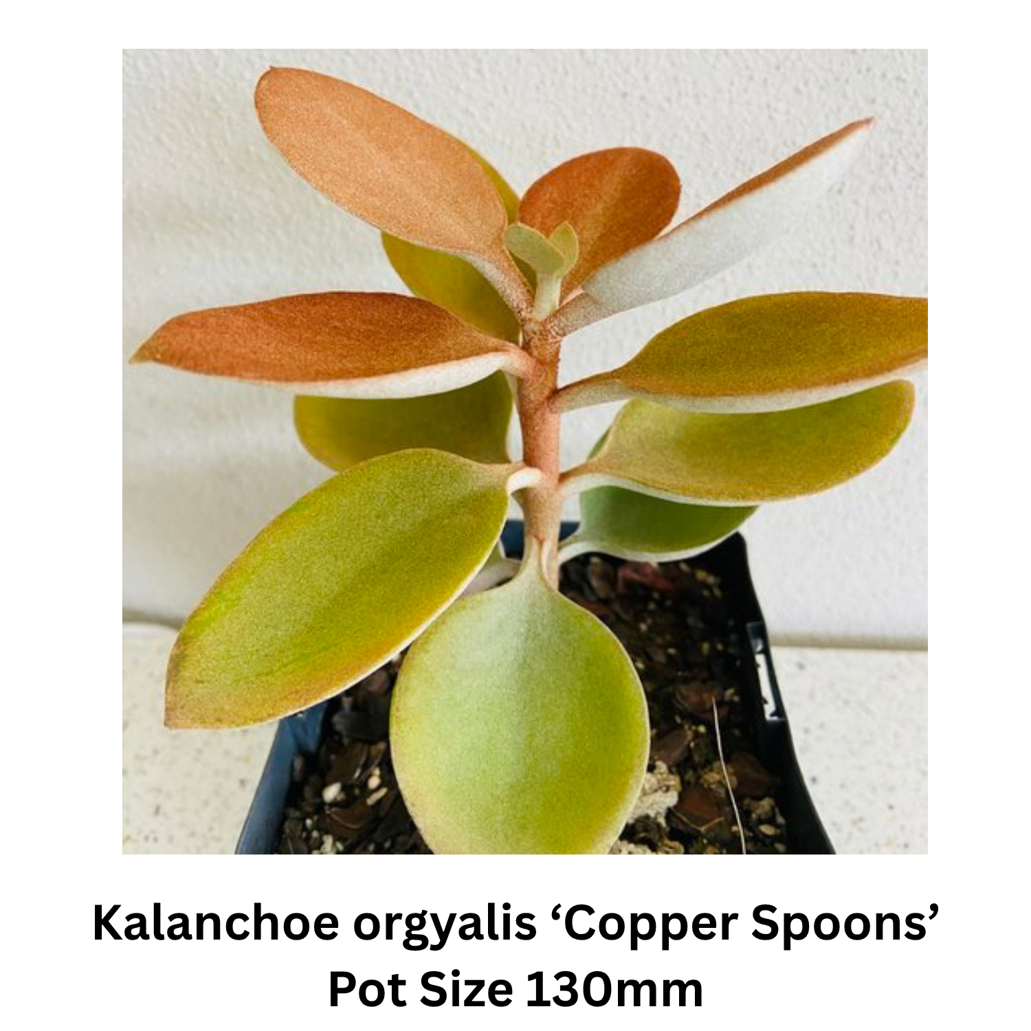 Kalanchoe orgyalis ‘Copper Spoons’ – Striking copper-bronze foliage that develops a silvery patina with age.