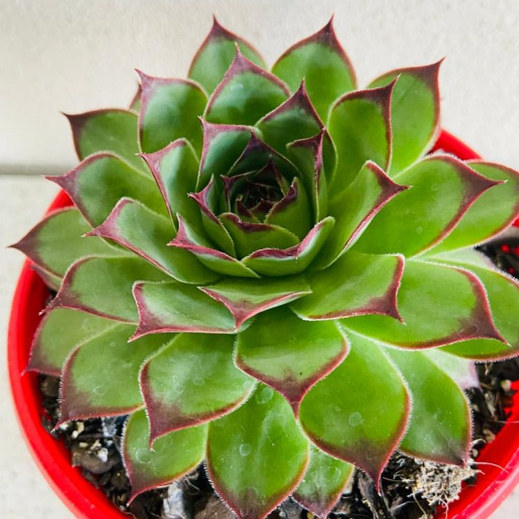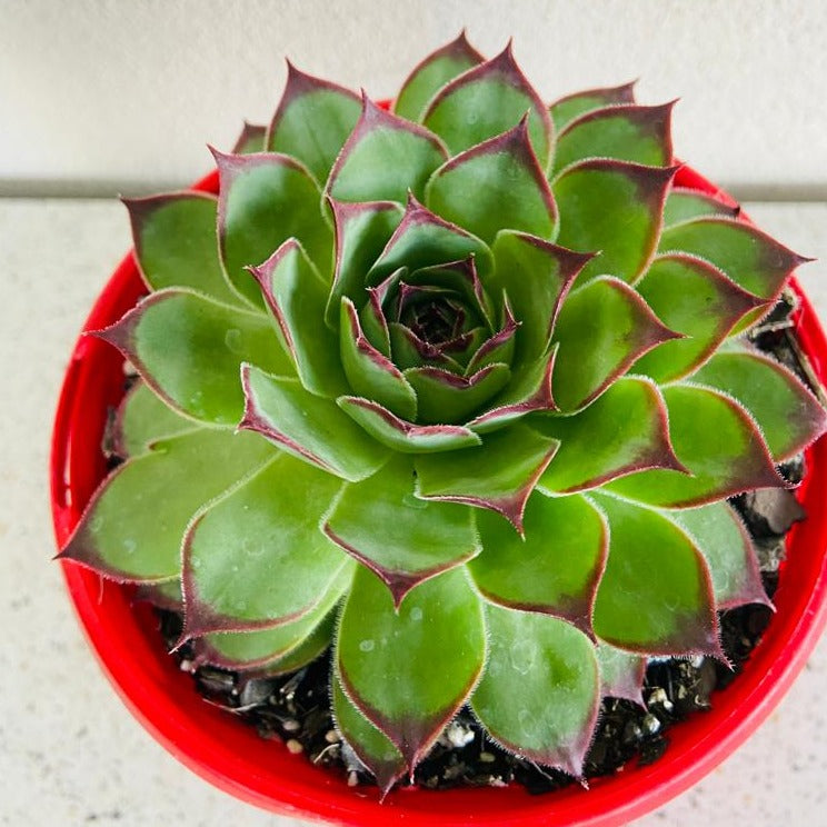 Sempervivum tectorum, also known as the Common Houseleek, is a classic rosette-forming succulent prized for its hardiness, symmetry, and charming alpine appeal. Native to the mountains of Europe, this cold-tolerant succulent features fleshy, pointed green to reddish leaves arranged in tight rosettes, often producing offsets or “chicks” around the mother plant — hence the popular name “Hens and Chicks.”