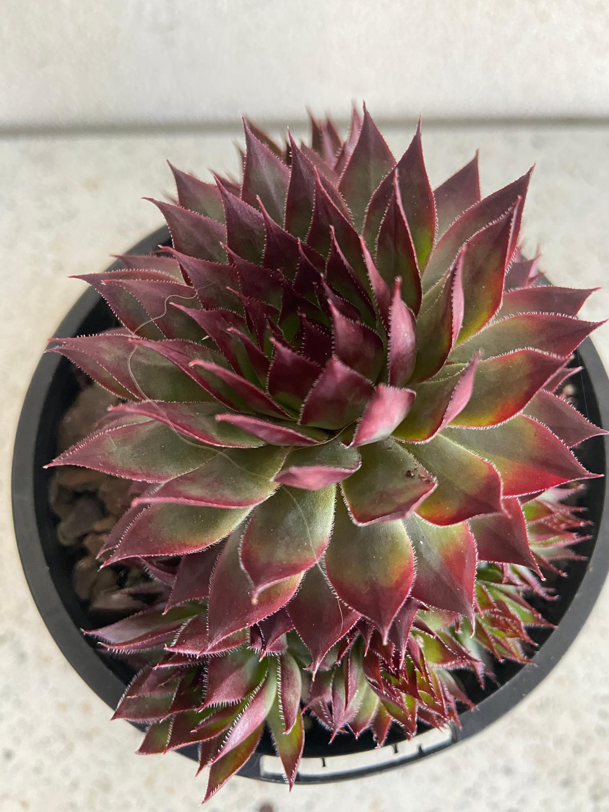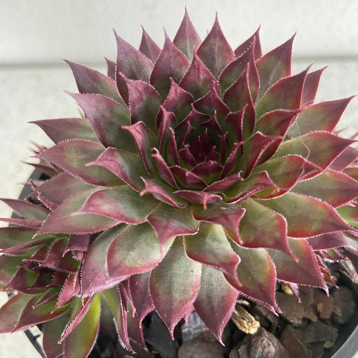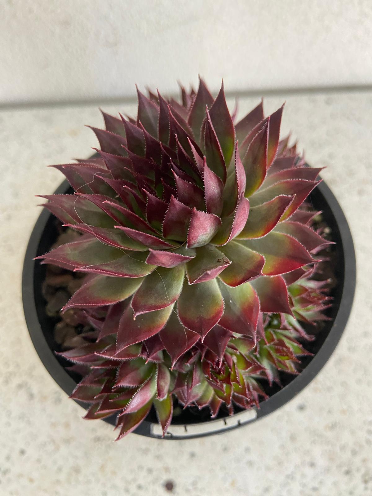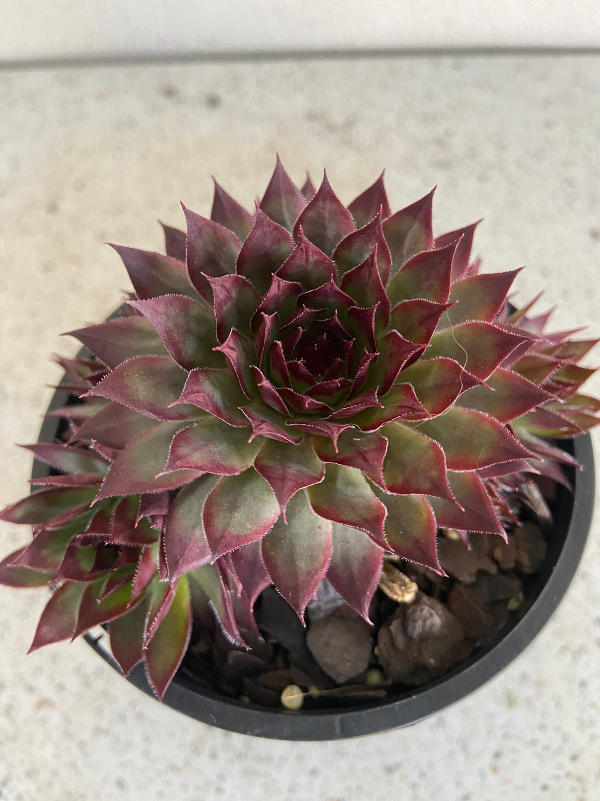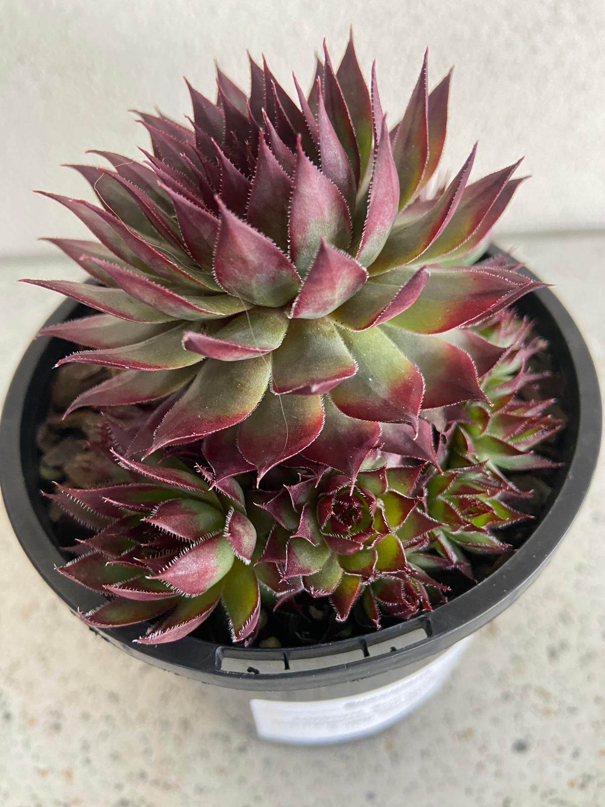 Sempervivum tectorum ‘Little Ruby’ is a charming and cold-hardy succulent known for its compact rosettes that flush deep ruby red, especially in cooler weather. This cultivar of the classic “Hens and Chicks” plant forms tight clusters of vibrant rosettes, spreading slowly to create a beautiful, low-growing mat.